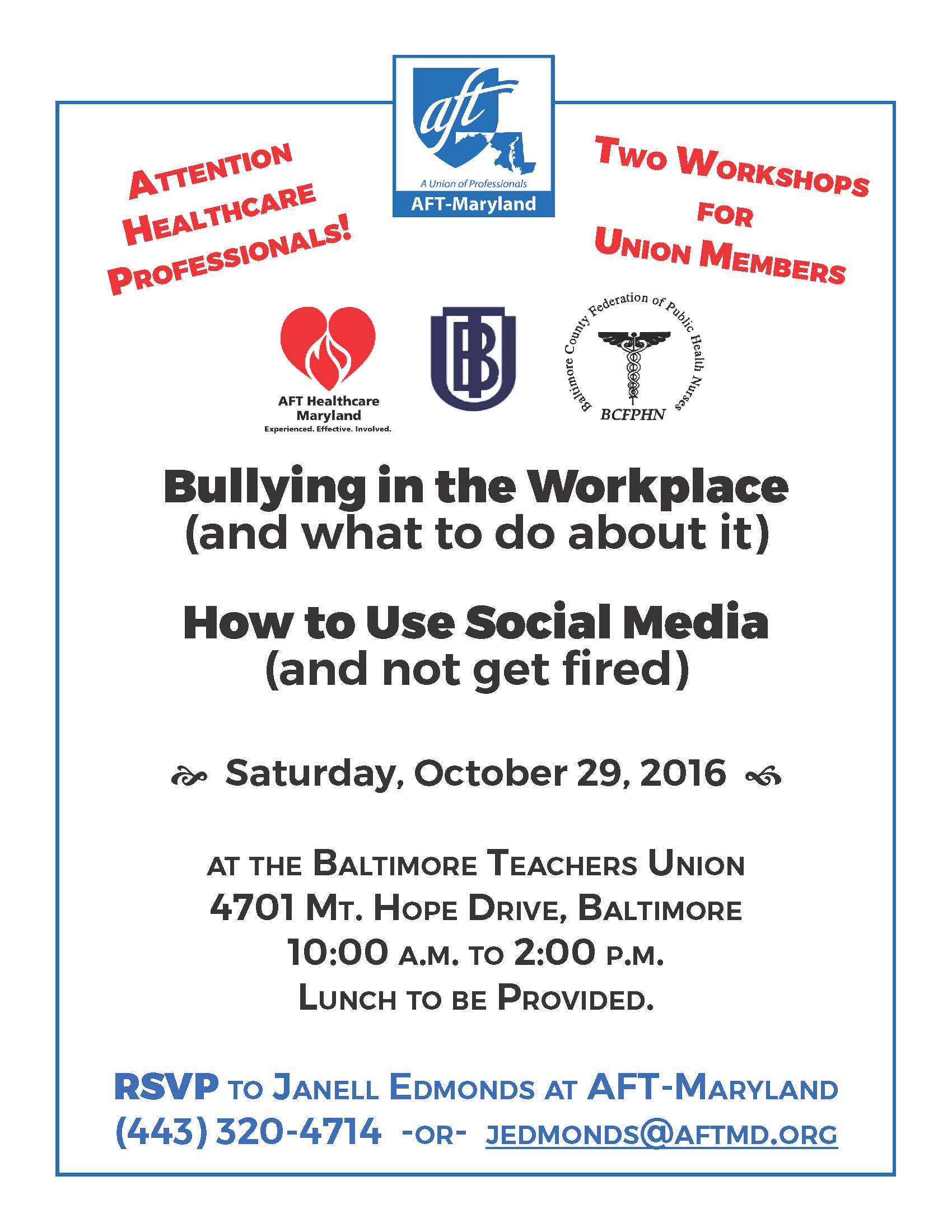 RSVP to Janell Edmonds at AFT-Maryland: (443) 320-4714 or jedmonds@aftmd.org.