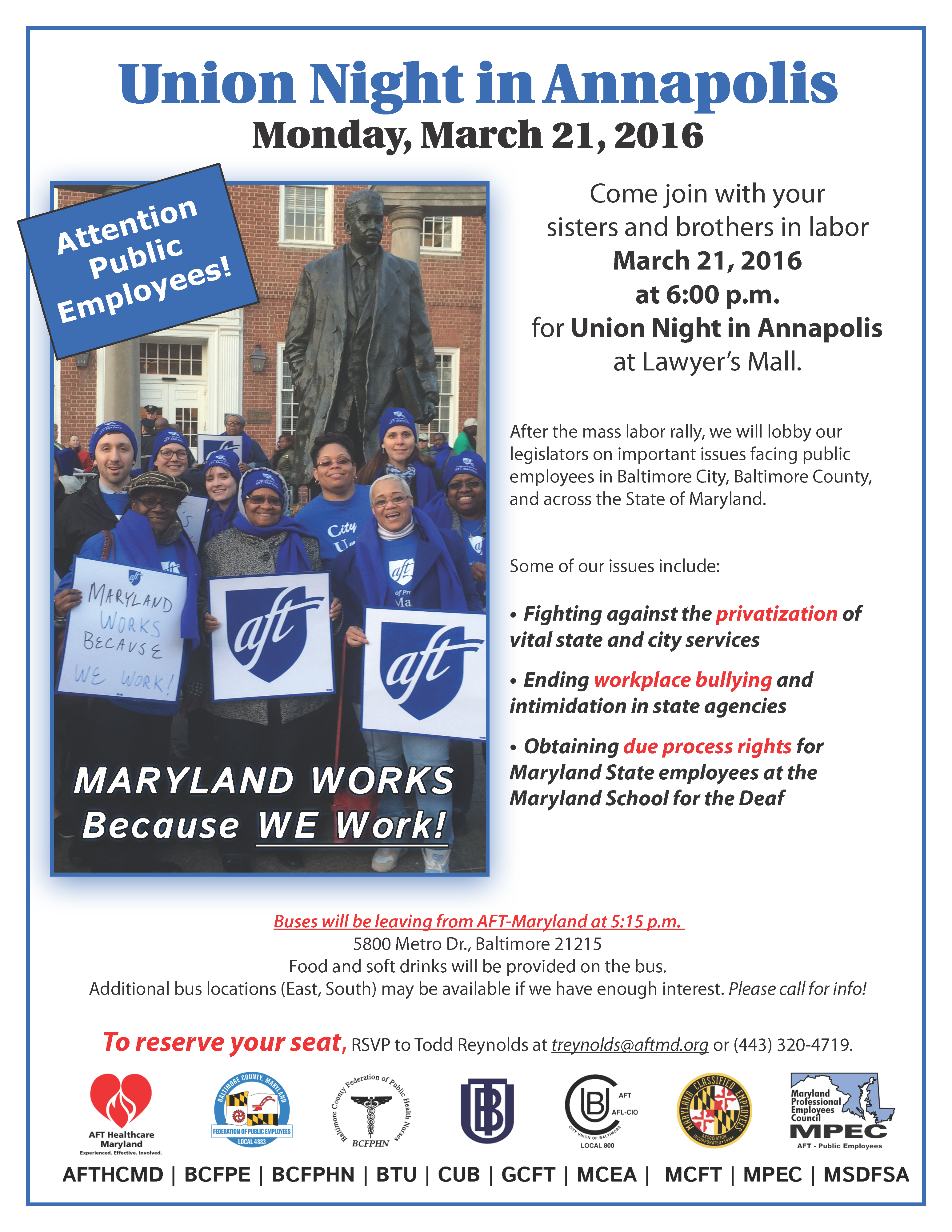Over a hundred members of the unions that make up AFT-Maryland took to Annapolis to engage their elected representatives. Lobby Night as it is called gave members and activists an opportunity to extend their voices directly to the people that they elected. Nearly all of the locals that make up AFT-Maryland were represented and union members did not hesitate to ask Delegates and State Senators tough questions.
